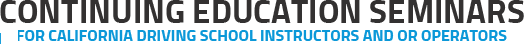 If you would like to bypass your Instructor or Operator test when your license comes up for renewal, all you need to do is take our 3 informative online seminars. After each online course has been completed, you will be able to either print out your completion certificate or email it to yourself to print out at a later time. You will take your 3 certificates with you to the DMV, along with your renewal application, and you will NOT be required to take the renewal test. Our seminars are approved by the California Department of Motor Vehicles and will fulfill the requirements for the driving school operator and instructor. You can take the courses at your own pace and log in and out whenever it is convenient for you. Also, we have put a security measure in place so you do not take the same course twice. Each completion certificate has the number of the seminar you took, so you will want to have completion certificates for seminars 1, 2 and 3.